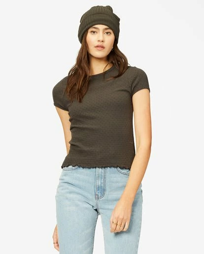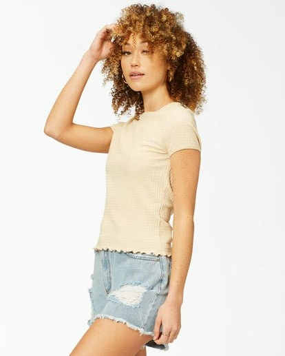 This women’s ribbed tee offers a fitted shape with binding details at the neck and sleeves.