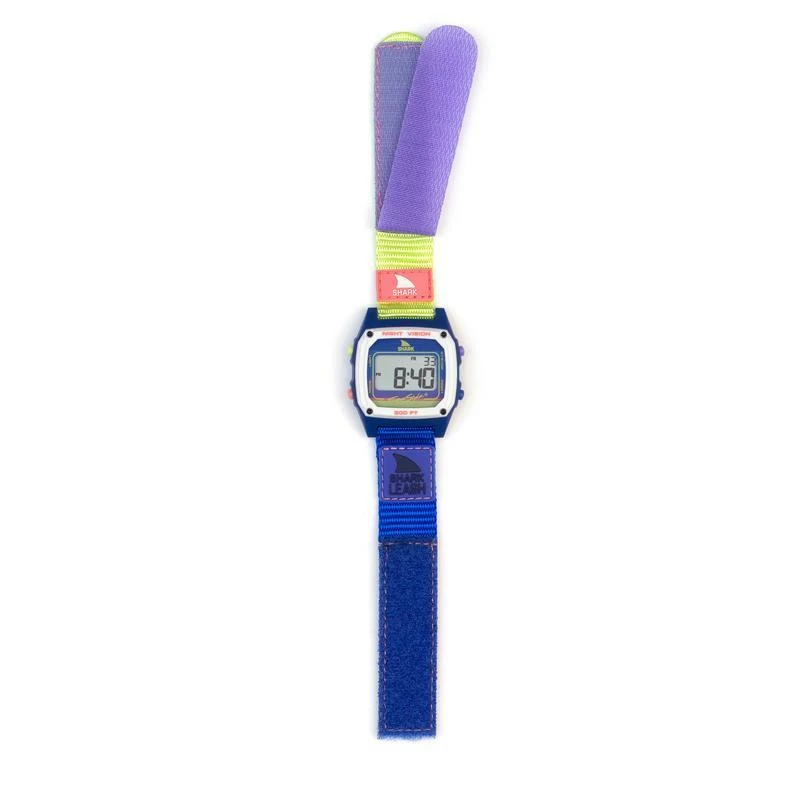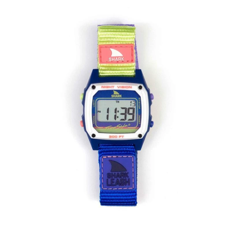 The original velcro band that launched the Freestyle watches in the 80’s is back and better than ever. The shark leash’s velcro closure system is modeled after an 80’s style surfboard leash, it comes loaded with standard digital features like: time, date, stopwatch, countdown timer, alarm and night vision backlight.