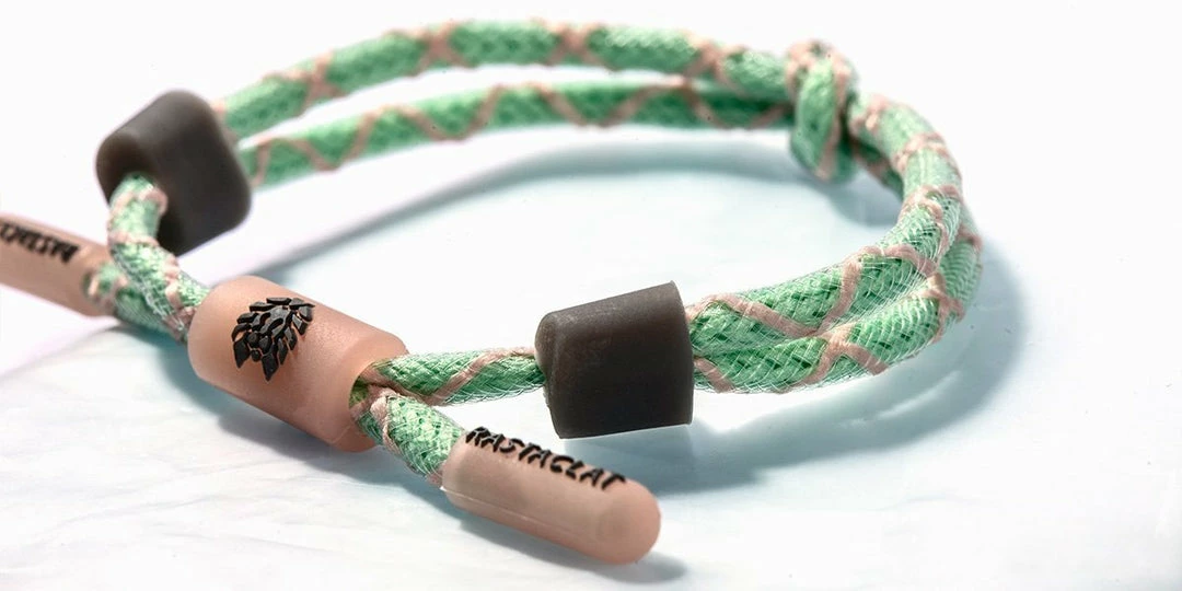 MINYT, LIGHT PINK AND GREY KNOTTED BRACELET FEATURING RUBBER HARDWARE AND CONTRAST EMBLEMS.