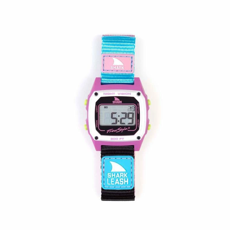 The original velcro band that launched the Freestyle watches in the 80’s is back and better than ever. The shark leash’s velcro closure system is modeled after an 80’s style surfboard leash, it comes loaded with standard digital features like: time, date, stopwatch, countdown timer, alarm and night vision backlight.