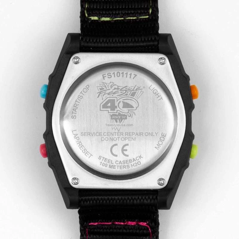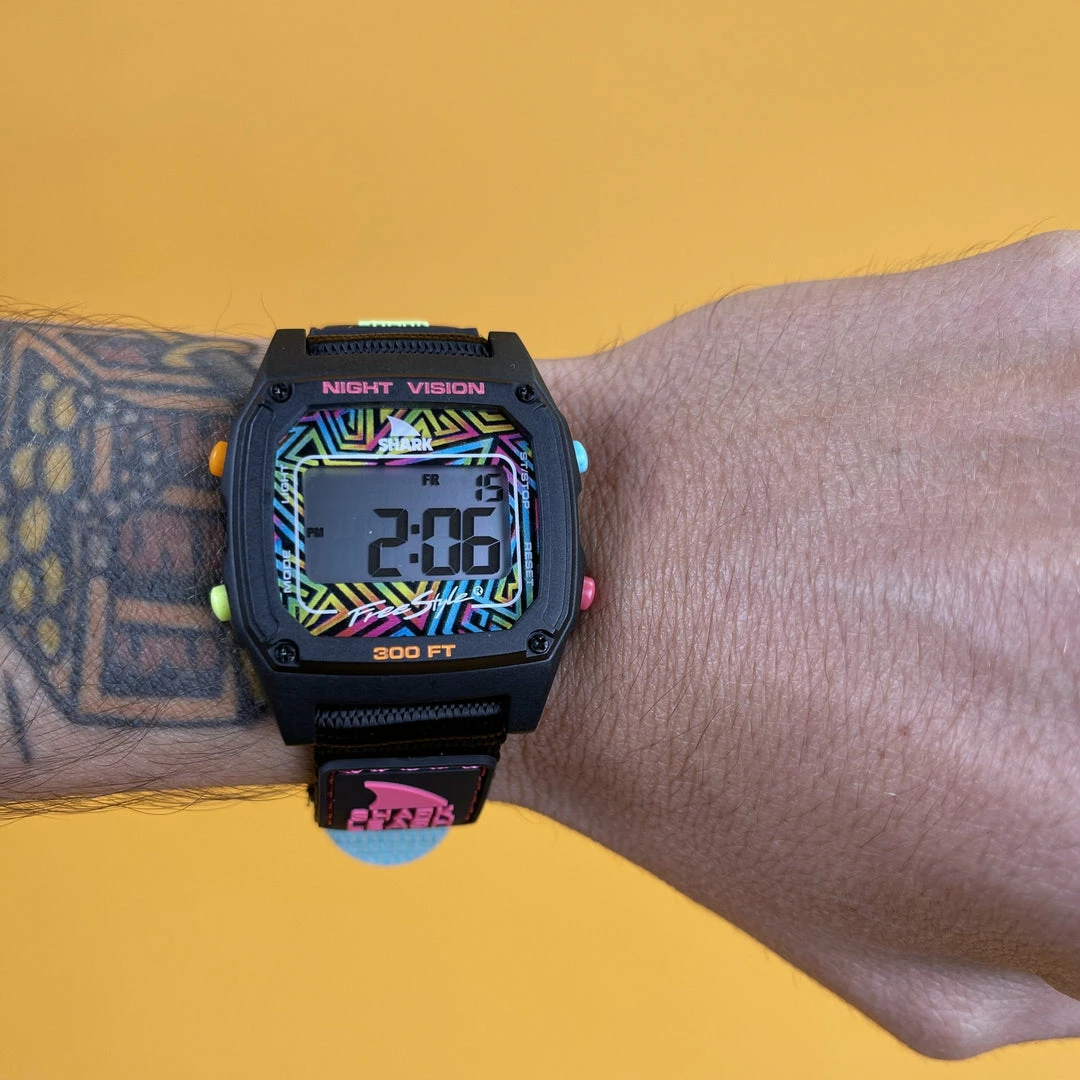 The original velcro band that launched the Freestyle watches in the 80’s is back and better than ever. The shark leash’s velcro closure system is modeled after an 80’s style surfboard leash, it comes loaded with standard digital features like: time, date, stopwatch, countdown timer, alarm and night vision backlight.