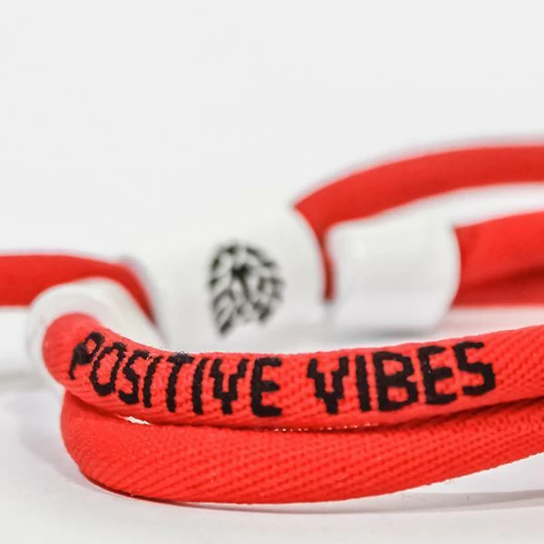 SPREAD THE MESSAGE! THIS REDÂ KNOTTED BRACELET READSÂ POSITIVE VIBESÂ IN BLACK LETTERING AND FEATURES WHITE HARDWARE WITH BLACK EMBLEMS.