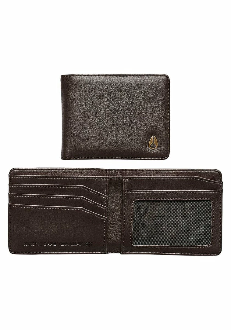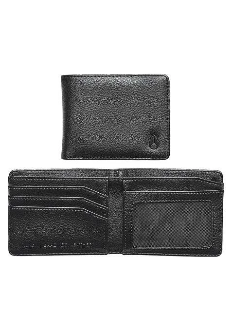 Vegan leather wallet with embossed interior. Features easy access currency sleeve, mesh ID window, and custom metal logo rivet at front.