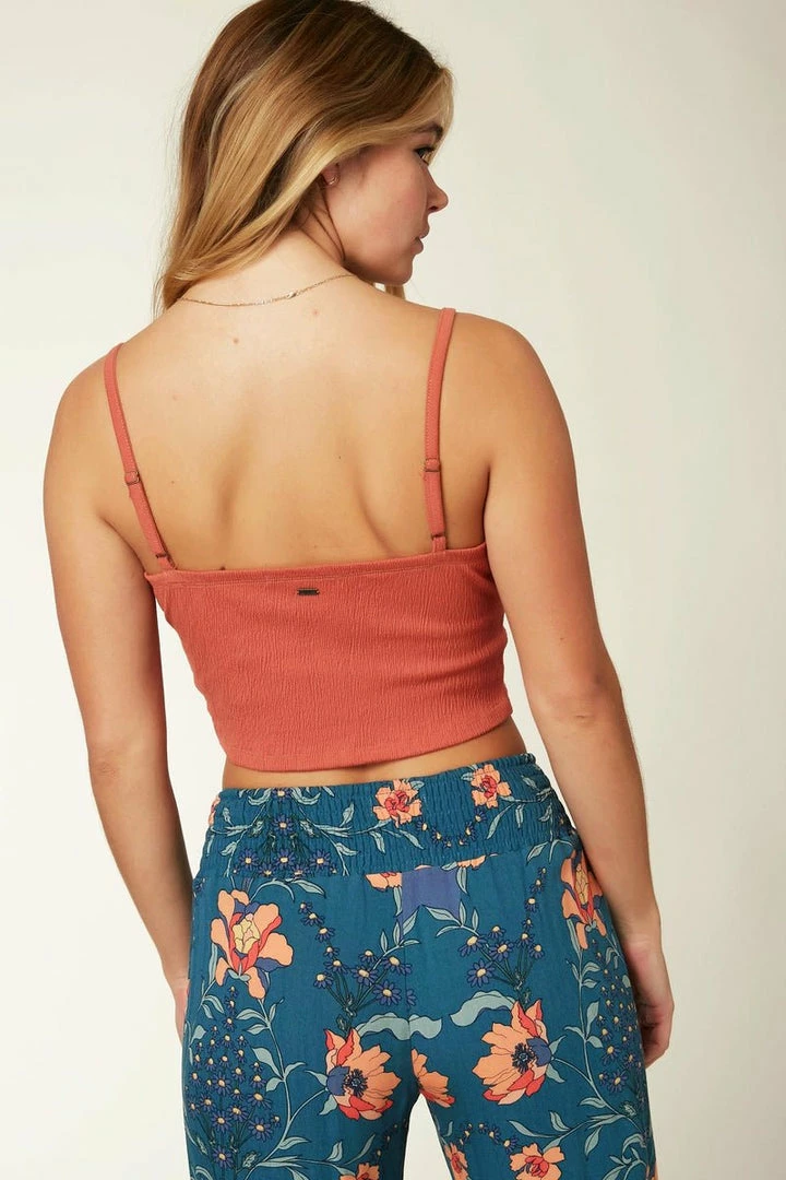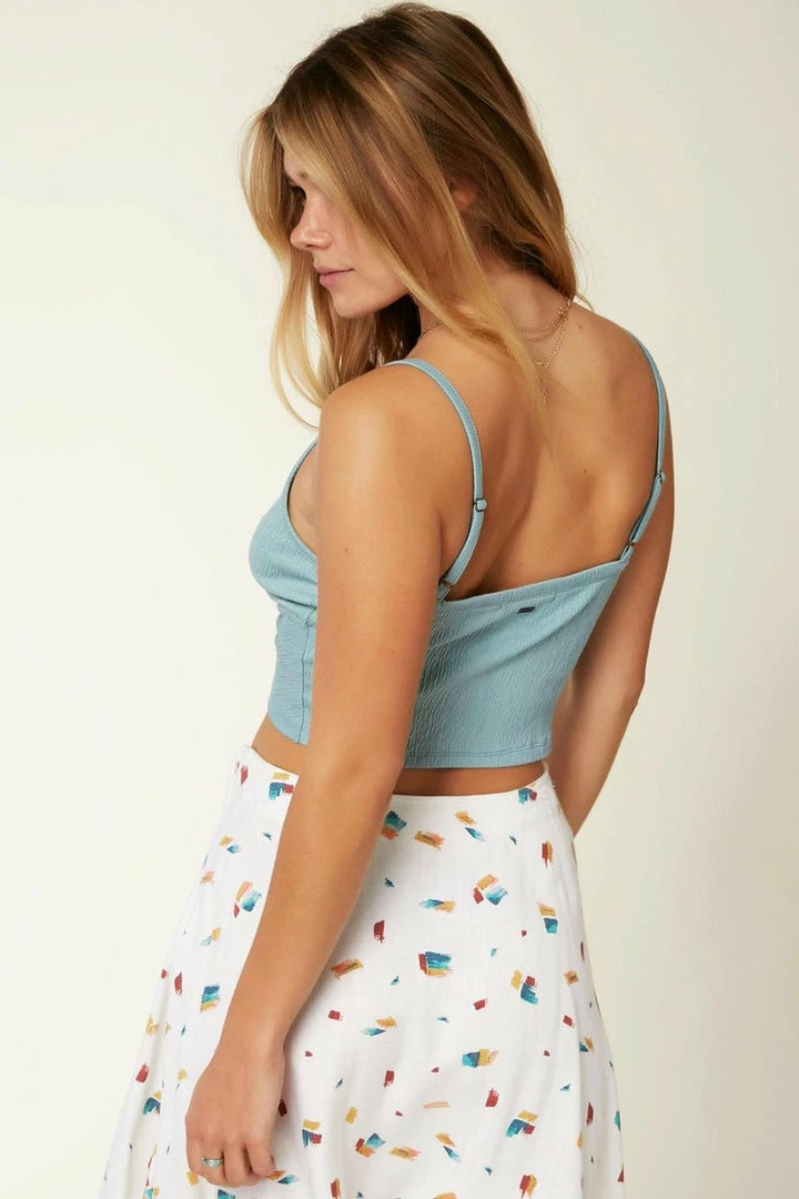 Fun and sunny knit tank that’s easy to pair with your favorite skirt or denim. It has a soft cotton feel, front twist detail and cropped fit.