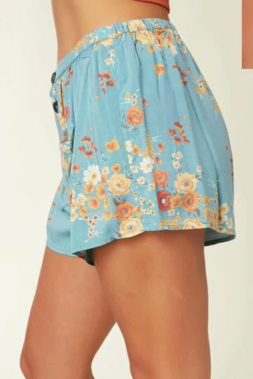 Cute and casual woven short that has a button up design, allover print and comfortable fit.