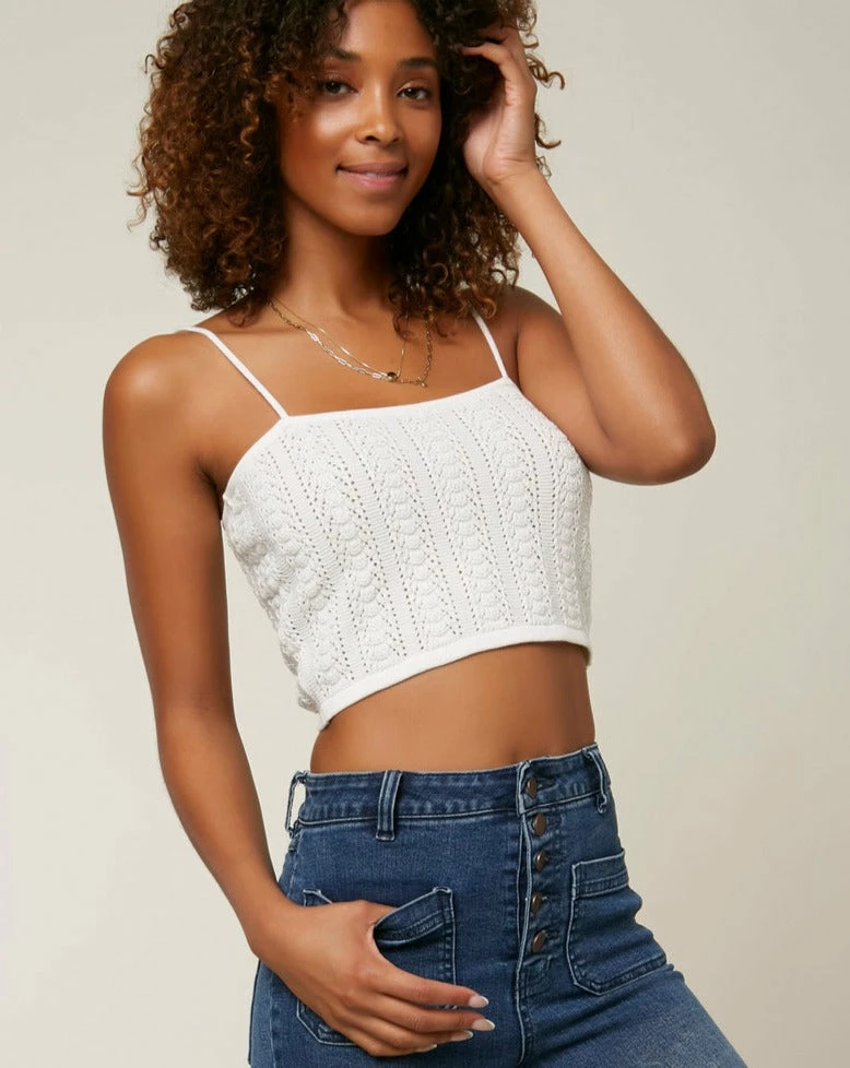 Cute and casual sweater tank top that has a super soft feel, cropped fit and over-the-shoulder straps.