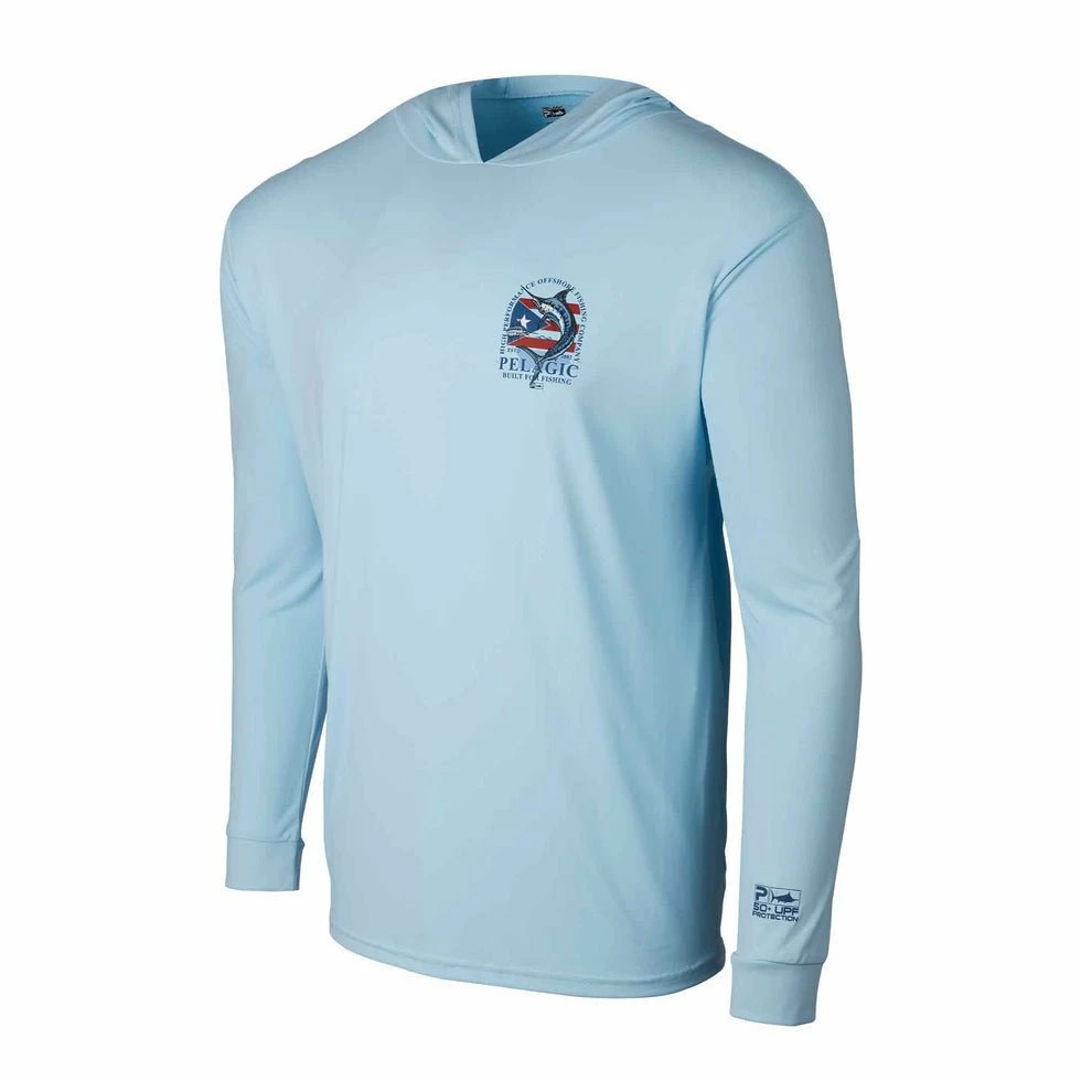 Paying homage to Puerto Rico with a blue marlin graphic surrounding the Puerto Rican flag, stamped with the Pelagic logo