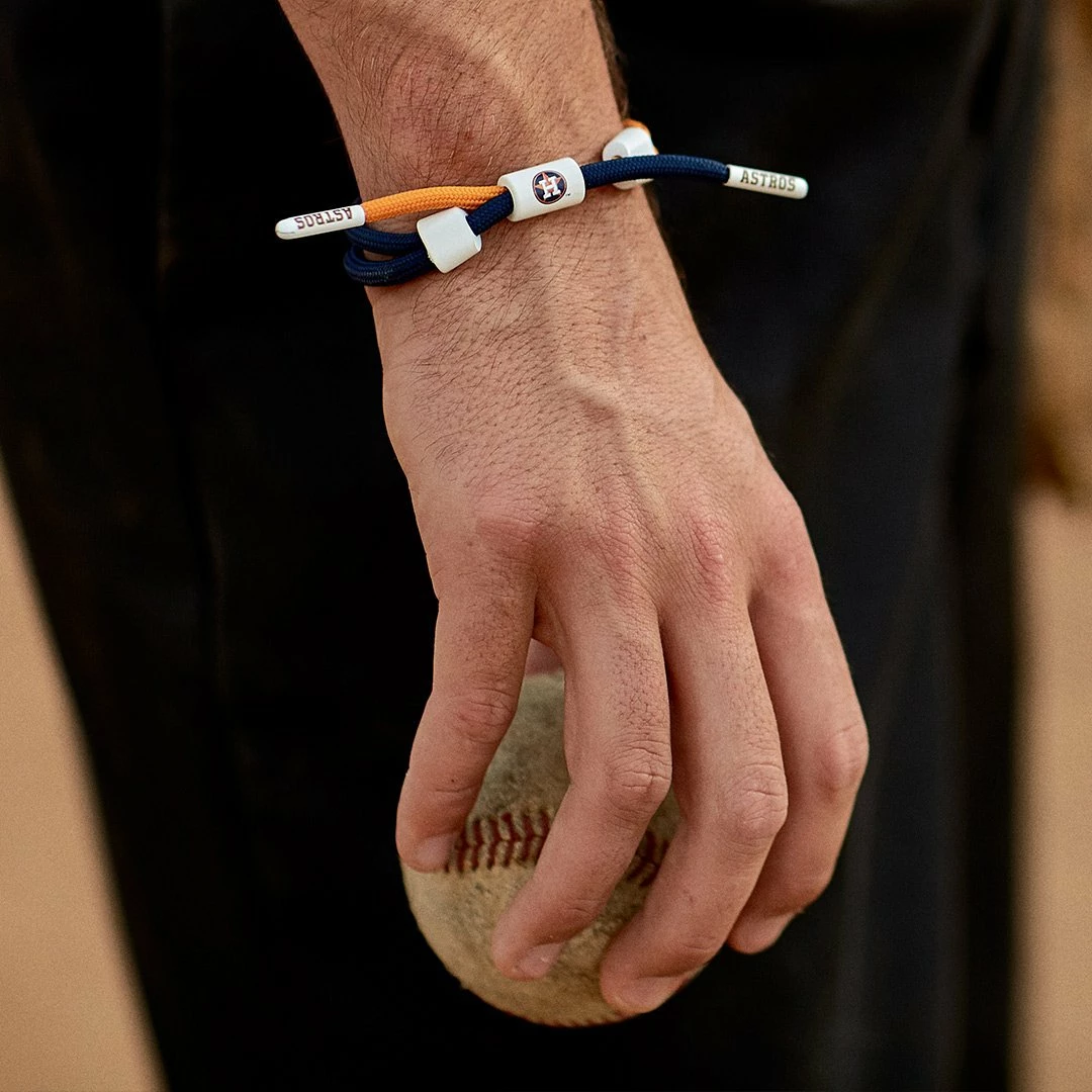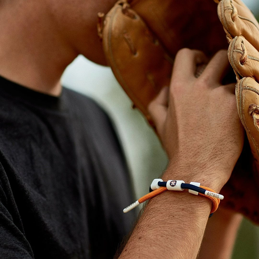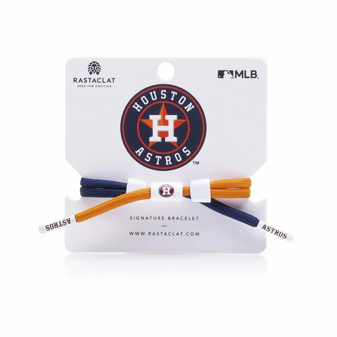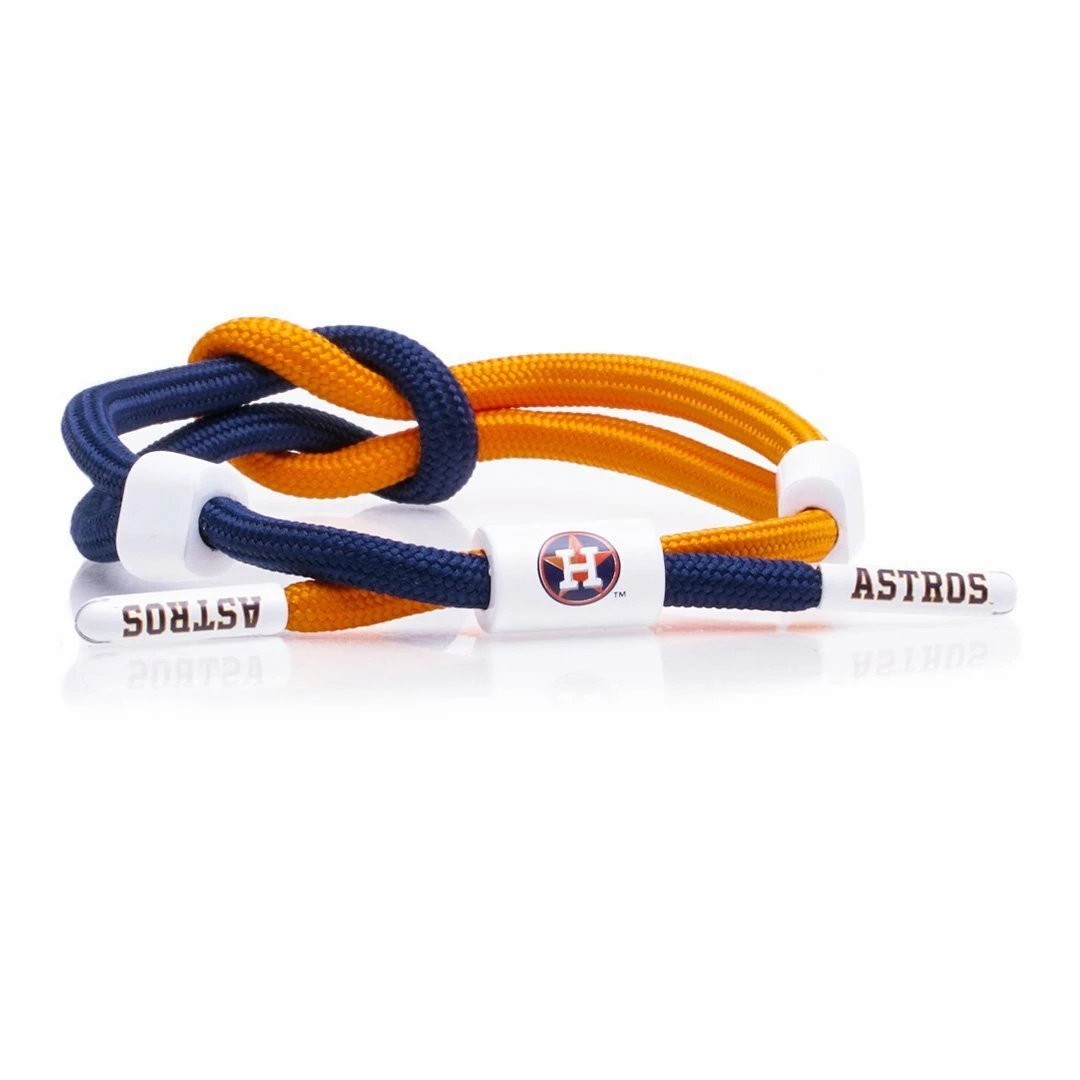 Orange and navy Houston Astros knotted bracelet featuring team logos on barrel and aglets. Each bracelet comes with an exclusive team headercard. 100% Polyester. One size fits most wrists, 6″ to 7.5″ in wrist circumference.