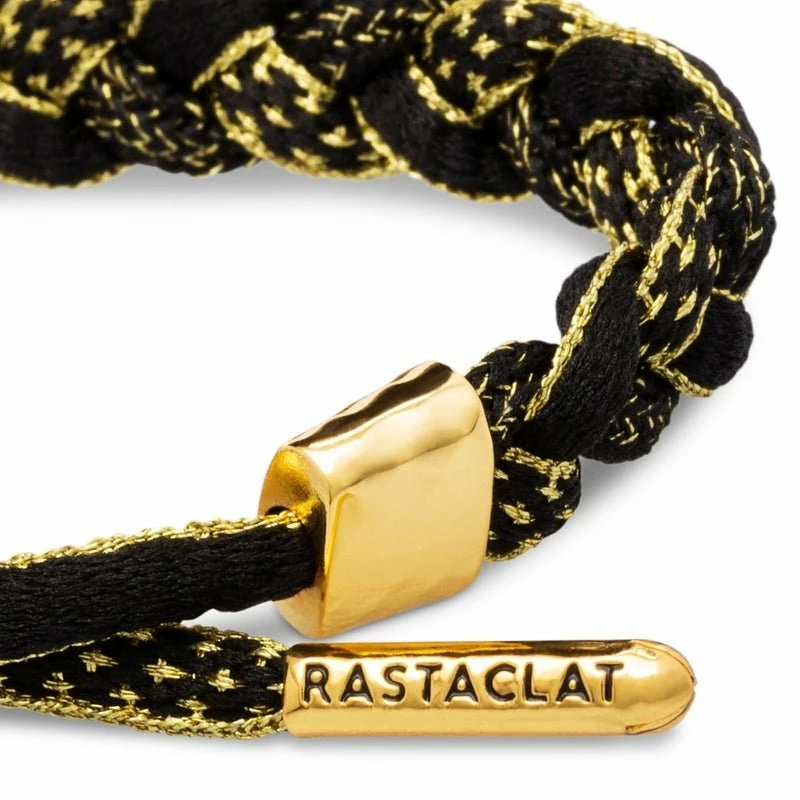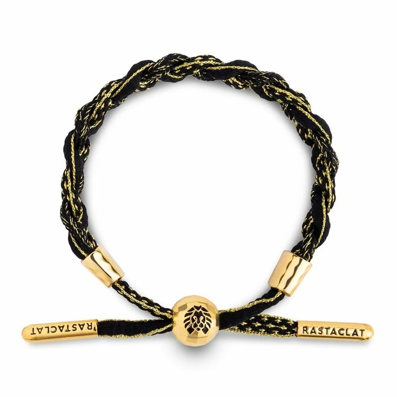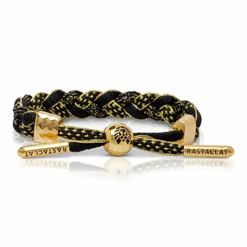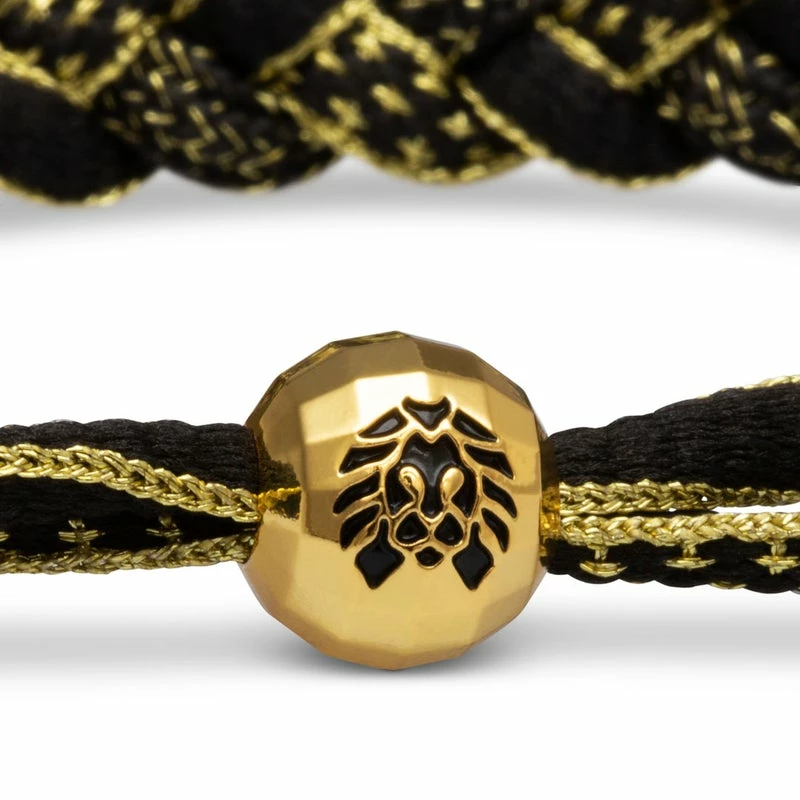 This bracelet is black and gold, braided, and features a faceted disco ball-inpired barrel, plus electro plated gold hardware with contrast emblems.