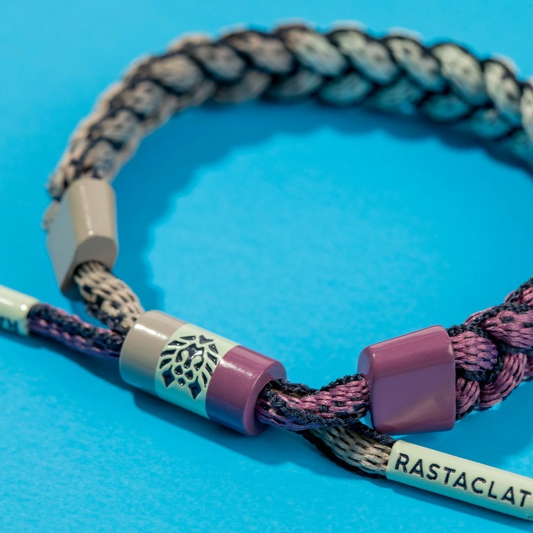 PURPLE, MINT AND GREY COLORBLOCKED BRAIDED BRACELET FEATURING ENAMEL HARDWARE AND CONTRAST EMBLEMS.
