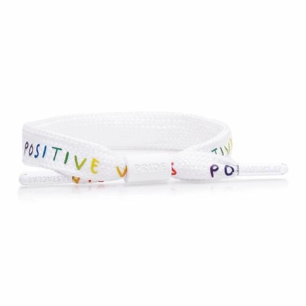 WHITE WITH PRIDE COLORS LACE BRACELET FEATURING ENAMEL HARDWARE AND CONTRAST EMBLEMS.