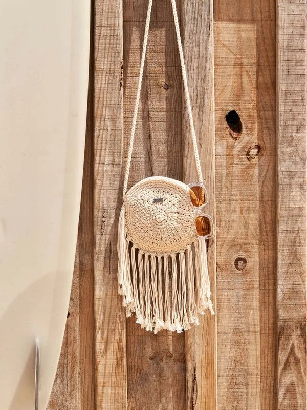This is a small crossbody bag made for summer. The cotton macramé fabric features an intricate knotted design with matching fringe. Complete with a top zip closure and metal ROXY plaque.