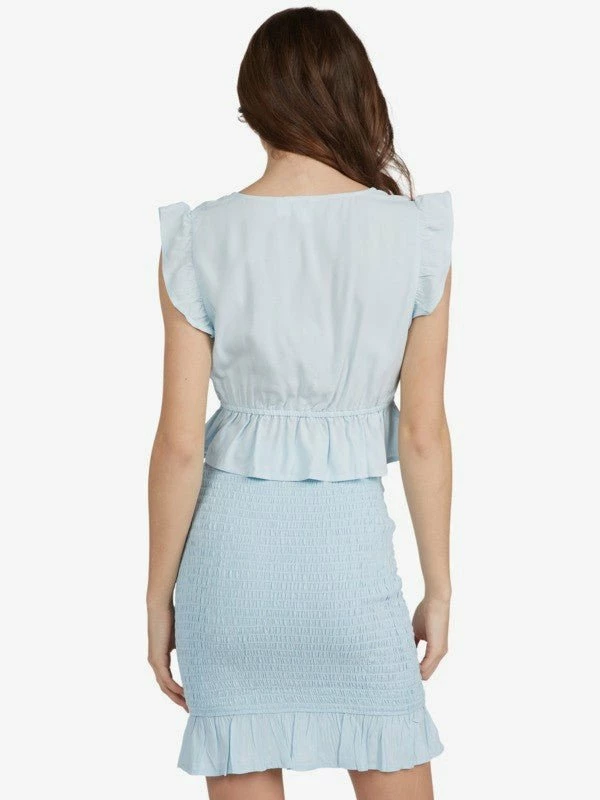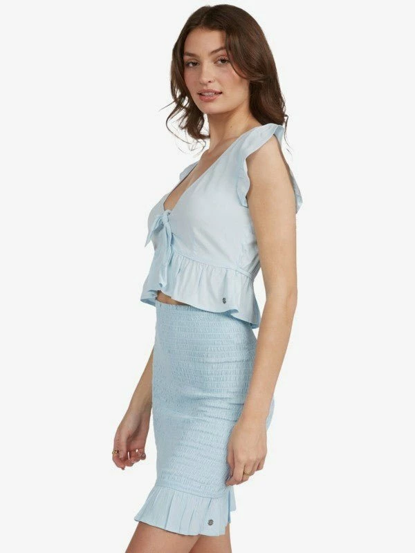The deep v-neckline with a cute front tie and cropped hem completes the look, while the elasticized back seam ensures a comfortable fit.