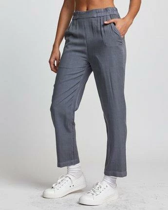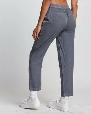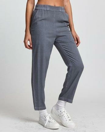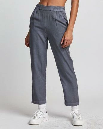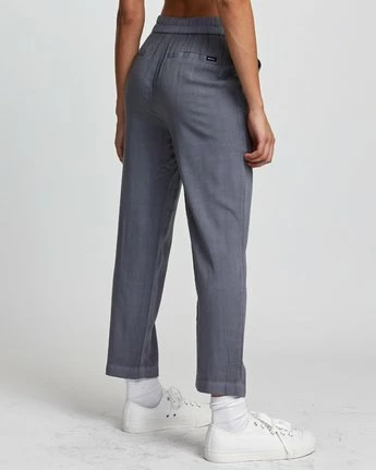 RELAXED ON TOP AND REFINED DOWN LOW, THE RVCA MANLIA PANT IS YOUR GO-ANYWHERE ESSENTIAL. MADE FOR TRAVEL, LOUNGE, WORK OR PLAY, THE WOMENS ELASTIC WAIST PANT FEATURES A SLIGHTLY CROPPED FIT AND FLAT FRONT PANEL FOR A CLEAN LOOK. CLEANED-UP WITH FAUX WELT POCKETS AT THE BACK, THE WOVEN PANT FINDS A BROKEN-IN FEEL WITH AN ENZYME GARMENT WASH.