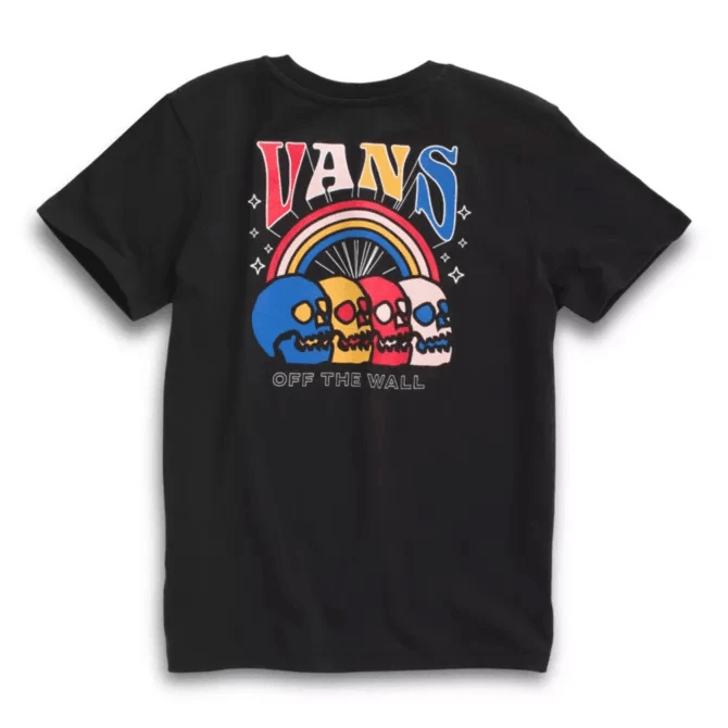 The Skelebow Tee is a 100% heavy cotton jersey crewneck t-shirt featuring rainbow and skeleton logo graphics at the left chest and back.